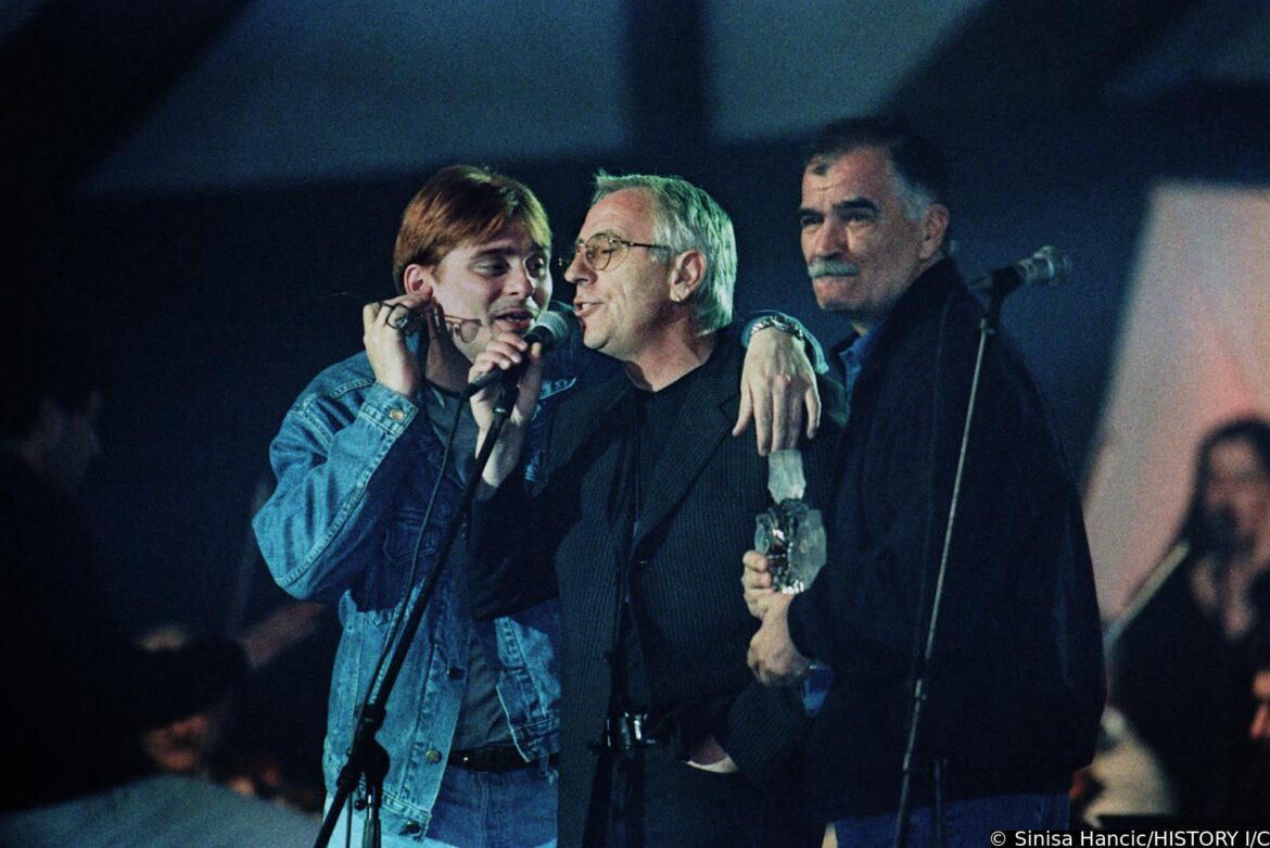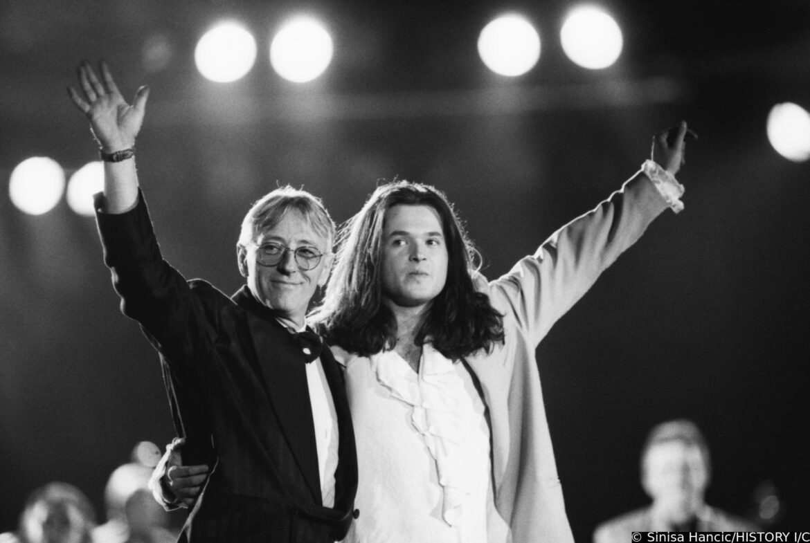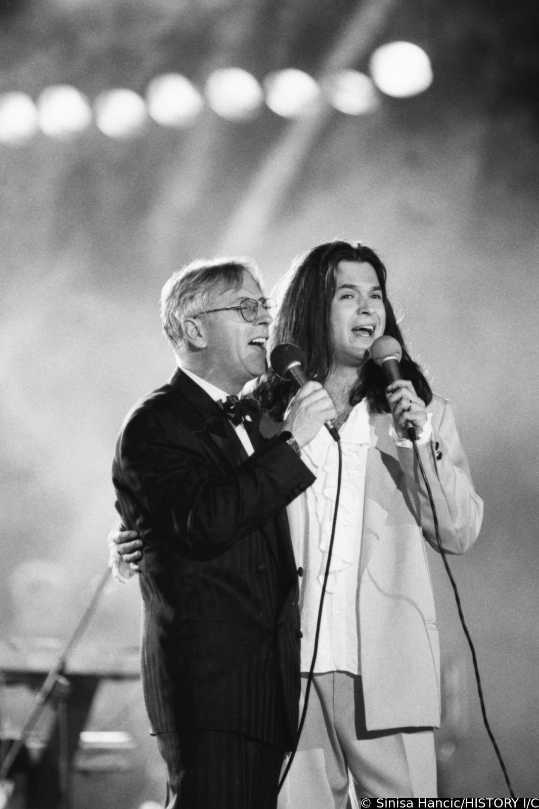 14.06.1994., stadion Maksimir, Zagreb - Oliver Dragojevic i Zlatan Stipisic Gibonni odrzali su zajednicki koncert pod nazivom Cesarica. Tribine stadiona bile su ispunjene do zadnjeg mjesta, no travnati teren bio je posve prazan. r"nOliver Dragojevic i Zlatan Stipisic Gibonni, dirigent i aranzer Stipica Kalogjera i Stanislav Mlinar ravnatelj Simfonijskog orkestra HRT-a s reporterkom HRT-a u javljanju uzivo iz kombija za program HRT-a. r"nPhoto Sinisa Hancic/PIXSELL